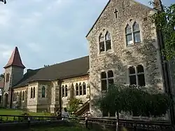 The Victorian chapel and school buildings were designed by William Munt in a Gothic Revival style and was opened by Prince Albert and the Duke of Wellington on 18 June 1858.[10][11] The buildings were constructed using Kentish rag with Bath stone dressings, tiled roof, a two-storey tower with broached spire, with entrance porch to ground floor. It was granted Grade II listed status in 2002.[12] It was adapted for primary school use in 1953 and underwent major refurbishment in 2007, retaining the Victorian features, such as the scissors trusses. It now houses a large school assembly hall, a number of small classrooms, the main school reception and administration block. Reception and infant classes are housed in a modern building constructed in 2006. The three junior school classes occupy the refurbished 1954 school building.[6]