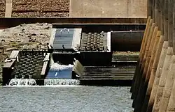 The barrage also incorporates a fish ladder to allow fish to get from the tidal water to the fresh water and vice versa.[9] The construction of the barrage had a significant impact on native fish species as it prevented them from accessing breeding, spawning and nursery habitats.[9] Although a fish passage was incorporated into the barrage during its construction, it was not very effective as it was designed for North American salmon. A new vertical fish passage was installed in 1996 which was an improvement on the original but it was only effective for eight hours each day during the high tides.[9] A new more effective $500,000 fish ladder was installed at the barrage in 2016, replacing the one which was installed in 1996.[9]
