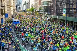 The TD Five Boro Bike Tour is an annual recreational cycling event in New York City organized by Bike New York. It is a charity event to fund Bike New York's education programs. Conducted on the first Sunday of May, the 40-mile (64 km) ride has over 32,000 riders. The route takes riders through all five of New York's boroughs and across five major bridges. The entire route, including bridges and expressways which normally prohibit cyclists, is closed to automobile traffic for the ride.[1][2]
