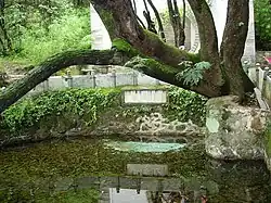 Travelers and tourists are drawn to the Butterfly Spring in Dali because of the film Five Golden Flowers. Butterfly Spring is situated at the foot of Shenmo Mountain (the first peak of the Cang Mountain) in Yunnan Province, 27 kilometers in the south of Dali ancient city. It covers an area of 50 square meters. Butterfly Spring was turned into a park in 1978, and in 1982 "the Dali Municipal Development Committee invested four million yuan (US$1.3 million at the official exchange rate, approximately US$400,000 at unofficial rates) to develop the park into a tourist site."[17] The park was designed to mirror the famous Butterfly Spring scenes in Five Golden Flowers, which were shot at a studio in Changchun rather than on location. An ancient tree branch above the pool had served as the model for the tree branch behind Jin Huan in the film when she sings by the Butterfly Spring. After the ancient tree died, a fiberglass branch "covered with real bark" was constructed to match the setting of the film.[17]