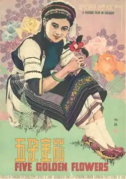 In contrast to the violent reality in Serfs, minority films set in the southwest region "routinely featured picturesque landscape, melodious music and songs, beautiful costumes, exotic customs and romantic love".[12] Typical of the southwest genre is Five Golden Flowers. Set in Yunnan, a frontier region of southwest China. It is a musical version of a love story that avoids the depiction of class struggle. To stay close to the reality of the Bai minority, "the representation of songs and dances in Five Golden Flowers corresponds to the reality that singing was an important and integral part of the Bai people's daily life expression and communication."[7] The Han musician in the film has a line, "There is a variety of folk songs here. Even the song that expresses anger is enchanting (zheli de minge ke zhen fengfu, lian maren de ge dou name haoting)." The line indicates the Bai people's "singing while living (ban ge er ju)" lifestyle.[13] The Bai people dressed in colorful costumes with delicate ornaments were engaged in song and dance while they declared their love. Yang Likun, a Yi ethnic actress, played the female protagonist in the film. However, the film did not deviate from the mainstream message of the political campaign by "projecting a utopian vista for community and society".[14] Characters were figured as "model workers" who were fully committed to socialist construction. Minority films in China provided journeys to the infinite landscape in the northwest or the "tropical climes" in the southwest, a world that was seen as foreign to the Han audiences.[7] All the ethnic characters in minorities films speak Mandarin instead of dialect in order to achieve a national unity and bridge the linguistic gap.[6]