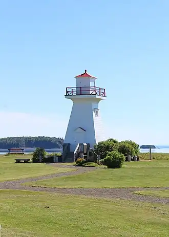 Five Islands is home to one lighthouse at Five Islands Lighthouse Park. The existing tower was originally built in 1914, and later moved in 1952 and 1957.[5] Having deteriorated over the years, the tower was saved from being demolished by the Five Islands Lighthouse Preservation Society and moved to the Sand Point campground as a tourist attraction in 1996. In 2008, the Five Islands Lighthouse was moved to a nearby municipal park, becoming the focal point of said park.[6]