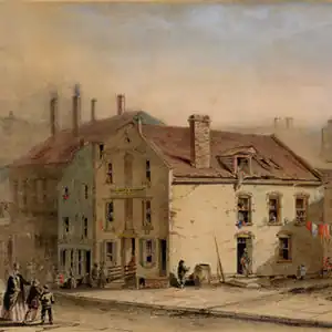 A major effort was made to clear the Old Brewery on Cross Street, described as "a vast dark cave, a black hole into which every urban nightmare and unspeakable fear could be projected."[31] The Old Brewery had formerly been Coulthard's Brewery, which was located on the outskirts of the town less than thirty years earlier in the 1790s. Later enveloped by the growing city, it was located on Cross Street just south of the Five Points intersection. The brewery became known as the "Old Brewery" after being converted to a tenement / boarding house in 1837. Its lower, high-ceilinged floor and the above two floors were converted into four floors of rundown apartments. The rent was cheap and attracted many low-income tenants, many of them immigrants. The only census record taken in 1850 reported 221 people living in 35 apartments, averaging 6.3 persons per apartment.[31] Accounts conflict as to the total number of people living in the Brewery flats, but all agreed that it was well over capacity.