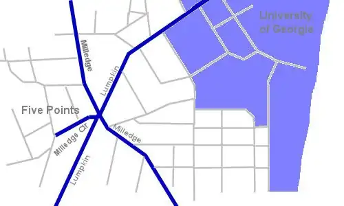 Five Points is a retail corridor and neighborhood in Athens, Georgia, centered on the intersection of Milledge Avenue and Lumpkin Street. It occupies the South-Southwest edge of the University of Georgia campus. Milledge Avenue is home to many University of Georgia Greek chapter houses, and is included in a tour by the Athens Welcome Center.[1]