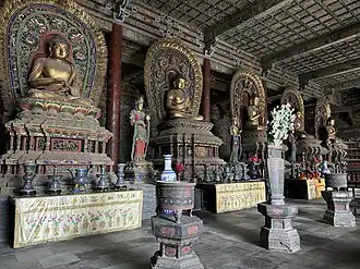 Ming dynasty (1368–1644) statues of the Five Tathāgatas in Shanhua Temple in Datong, Shanxi, China. From left to right: Ratnasambhava, Amitābha, Vairocana, Akshobhya, Amoghasiddhi
