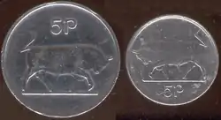 The five pence (5p) (Irish: cúig phingin) coin was a subdivision of the Irish pound. It was introduced in Ireland on Decimal Day, 15 February 1971 and reused the design on the shilling coin produced for the Irish Free State in 1928. Some shilling coins remained in circulation until the early 1990s, with the same nominal value as the five pence coin.