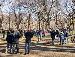 Zoo officials and some other birders criticized the sharing of the bird's location on social media.[7][15] Publicly sharing the location of owls is a controversial practice among birders, particularly in New York City. Owls like Flaco are nocturnal hunters and roost during the day, when crowds of people can disturb their ability to rest, especially those who do not follow standard ethical guidelines for birdwatching, for example getting too close or making loud sounds to get a bird's attention for a photograph.[40][43] The large number of people may have made him more conspicuous to potential prey or to birds prone to mobbing behavior, interfering with his ability to hunt or rest.[44]