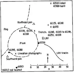 Flag crater is approximately 240 m in diameter and over 20 m deep.[2] The adjacent crater Plum is only about 30 m in diameter.[3] The slightly larger crater Spook, also visited by the astronauts, lies less than 1 km to the east.