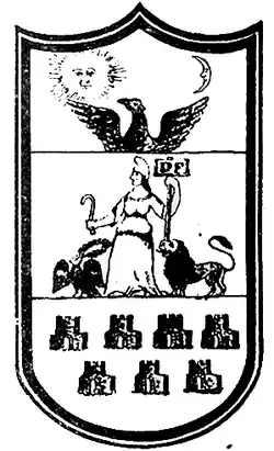 ShieldPer fess Azure and Or, a fess Gules between in chief an eagle issuant from the division Sable flanked by a sun-in-splendour Or and an increscent Argent, and in base seven towers Gules.