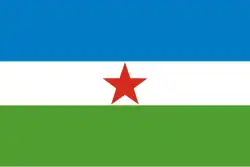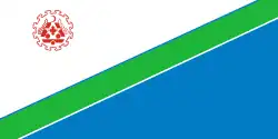 Design by Alchibaev (no last name provided). | A vertical tricolor of white, blue and green, with a red star on the upper left corner. |