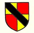 The yellow and red quadrants (Quarterly Or and Gules) are taken from the arms of the Beauchamp family, powerful in the county after the Norman conquest of England and constructors of Bedford Castle. The blue and white wavy lines (a Fess wavy barry way of four Argent and Azure) are symbolic of the Great Ouse, which flows through the county, including the county town of Bedford. The three vertically-arranged shells (or scallops) on a black panel (a Pale Sable charged with three Escallops) are taken from the coat of arms of the Dukes of Bedford.[2][1]
