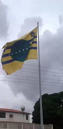 The flag of Bolívar State was designed by cinetic artist Jesús Soto. It is composed by three colors: the yellow field, representing the riches of the state. Over the yellow field, a green circle, representing the abundant vegetation and three blue fesses separated from each other to represent the rivers that cross the Bolívar State.