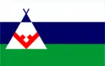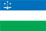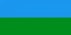 The flag of Khanty-Mansi Autonomous Okrug[a], in the Russian Federation, is a rectangular field arranged with two strips at even proportions (azure on top, and green on bottom). A vertical white strip is attached to the fly side of the flag. A stylized crown at the upper hoist side is charged on the azure strip.