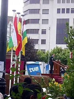 A major impetus for the flag's adoption was its use during the celebration known as "I Día de La Rioja", celebrated in Nájera in October 1978. From that point on, various regional collectives adopted the flag for their use. In January 1979, some townspeople from Haro asked their mayor to fly the flag from the town hall, as other town halls already were flying it. The association "Amigos de La Rioja" sent a letter to the president of the provincial council asking that the flag fly from the Provincial Palace (Palacio de la Diputación).[5]