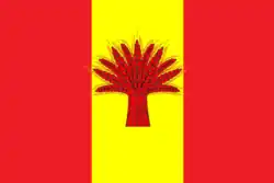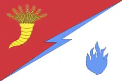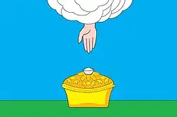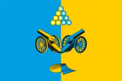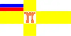 The flag of Stavropol Krai of Russia is a Nordic Cross charged with the krai's coat of arms in its centre. The cross itself is white set on a golden background. In one version, the coat of arms is depicted entirely in gold, in correspondence to the flag's background. In another version, it is in its full array of colours.