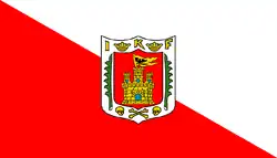 The flag of Tlaxcala was adopted in 2016. It is colored red and white and bears the State Emblem in the center. The emblem consists of a rectangle ratio of width-length 3:2, divided by a diagonal line from the bottom right (hoist-side) to the downer left. Ribbons of the same colors may be placed at the foot of the finial.[1] This flag was designed by Desiderio Hernández Xochitiotzin in 1996.