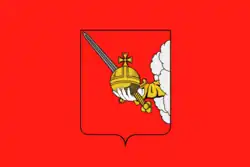The flag of Vologda Oblast, a federal subject of Russia, was adopted 26 November 1997.[1] The flag is a field of white, with a red vertical band on the fly. A charge of the Vologdan seal is in the upper hoist corner. The seal is red, with a hand emerging from a cloud, holding an orb and a sword. A crown floats over the hand. The ratio of the flag is 2:3.