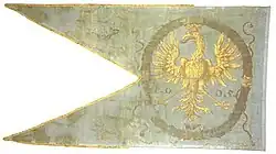 The banner of the Duchy of Teschen, since 1605, remains the oldest preserved image of the ducal flag. The banner was ordered by Duke Adam Wenceslas, who, in 1605, was appointed commander of the Silesian army. (As a vassal of the Habsburgs, in their capacity of the Bohemian kings, he was involved in anti-Ottoman wars in territory of Hungary and Moravia.) The banner was made of blue satin and 160 x 240 cm in size. In the front part, there is a gold-painted eagle of the Duchy of Teschen, and the free part ends with two sharp tongues.[3]