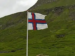The flag of the Faroe Islands (in Faroese: Merkið [ˈmɛʃtʃɪ]) is an offset cross, representing Christianity. It is similar in design to other Nordic flags – a tradition set by the Dannebrog of Denmark,[1][2] of which the Faroe Islands are an autonomous territory.[3]