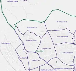Sometimes the name Rototuna is used to collectively refer to all of the city north of Wairere Drive and east of the Waikato River, including Flagstaff and its developments, including Magellan Rise.[4]