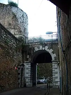 Prince Edward's Gate extends from the northwest corner of the bastion and overlooks Trafalgar Cemetery to the southwest and the former St. Jago's Cemetery to the northwest.[4][11][20] It was constructed adjacent to the retired flank and behind the orillon of the bastion's west wall, which aided the gate's defence. The gate was named after Prince Edward, Duke of Kent and Strathearn. At the time the gate was opened in the Charles V Wall, in 1790, the prince was serving with the military in Gibraltar.[4][19][20] Prince Edward's Gate is listed with the Gibraltar Heritage Trust.[7]