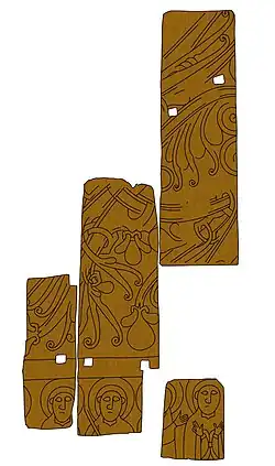 The Flatatunga Boards are carved wooden boards depicting apocalyptic scenes. According to Þórðar saga hreðu, in the 12th century, the boards in the lodge built by Þórður hreða ("the menace") Þórðarson in Flatatunga were carved with designs.[3] Some of these boards, known as the Flatatunga Boards (or Flatatunga Planks) carved in the 12th century and now preserved at the National Museum of Iceland, came from that specific lodge. However, other boards in the collection are thought to have more likely originated from a church, probably Hólar Cathedral. Only a very few of the boards, which are part of a large artwork in the Byzantine style that depicts Judgement Day, have been preserved. In addition, a good many of the boards were lost when the storehouse in Flatatunga burned down in 1898.[4]