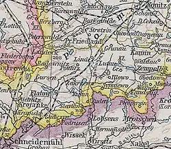 The area of the Flatow district originally belonged to the Netze District, which was annexed by Prussia in the First Partition of Poland in 1772.[1] In 1815, the area around Flatow became part of Regierungsbezirk Marienwerder in the province of West Prussia. The Flatow district was founded on 1 April 1818. It consisted of the five towns Flatow, Kamin, Krojanke, Vandsburg and Zempelburg.[2] The capital of the district was the town of Flatow. From 1829 to 1878, West Prussia and East Prussia were united to form the Province of Prussia, which belonged to the German Empire from 1871. The district was subjected to Germanisation policies.