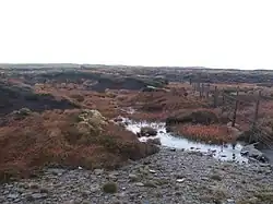 Whilst no accurate data exists for the rainfall on Fleet Moss, modelling based on similar peaks in the area (Top Duerley and Snaizeholme), suggests that Fleet Moss is subject to between 71 in (1,800 mm) and 79 in (2,000 mm) of rainfall per year. The rate of peat erosion is not wholly affected by weather, but more likely down to human interaction with the landscape,[20] with conservatives estimates placing the rate of sediment loss to be 15 tonnes (17 tons) per year suspended in water.[21] Manual drainage of the peatland was a normal agricultural practice, which involved creating ditches (called grips) that would drain off the water, (natural drainage channels are known as gullies).[22] The moors were drained gradually, but from 1840 onwards, the individual pockets of land were purchased by one family, who set about draining them intensively.[23] This process was increased dramatically in the 1950s to provide grazing land for cattle.[24][25] The draining has created scarring and columns of peat (hags) where the peat used to be, which has left the landscape looking akin to a war zone; so much so, that the location is known as The Somme and the distinctive features make it visible from space.[26][27] Areas to the north east of Fleet Moss are used extensively for grazing animals and shooting, with the south western side of the site noted for its peatland.[14]