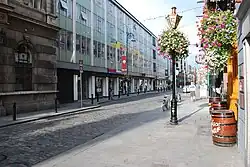 Although a wealthy area, and a centre of furniture-making,[9] Fleet Street went into decline in the 20th century and in the 1980s was set to be demolished, and a bus terminus built in its place. Instead, it was revived as a cultural area.[5] Today it is known for its many pubs, cafés and restaurants, including the Hard Rock Cafe, the Oliver St. John Gogarty, Bowes,[10] and The Palace Bar.[11][12][13] Fleet Street also contains the Irish HQ of Amnesty International, at Seán MacBride House.[14][15]