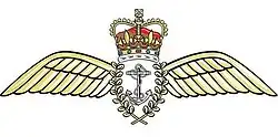 Aircrew wear flying badges, such as pilots wearing a pair of gold albatross wings. The wings badges also feature a crown and fouled anchor in the centre, to reflect the maritime element of the flying undertaken. Wings are worn on the left sleeve of naval aviators, unlike their other service counterparts.[32]