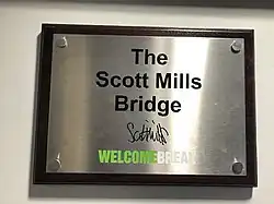 The Scott Mills Bridge was officially named on 16 March 2016. The naming followed a campaign by the Scott Mills Show's co-presenter Chris Stark to get things named after the BBC Radio 1 presenter. A plaque was unveiled at the site by Stark.[6][7]