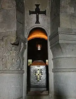 Anscar Vonier, writing in the Catholic Encyclopedia says that "from the very start the abbey boasted of two churches, one in honour of St. Peter and the other in honour of the Blessed Virgin."[4] The church of St Peter was demolished in the eighteenth century; the existing church dedicated to the Virgin pre-existed the founding of the monastery. After the ravages of the Normans, who penetrated via the Loire and burned the monastery buildings, which suffered a catastrophic fire in 1026, this became the great late eleventh-century Romanesque basilica, which occasioned the erection of a great tower, that was intended as the west front of the abbey church, which was completed in 1218. It was here that the Fleury Playbook was compiled, perhaps in dedication to the new church. The tower of Abbot Gauzlin,[5] resting on fifty columns, forms a unique porch. The Carolingian style church is about three hundred feet long, its transept one hundred and forty feet. The choir of the church contains the tomb of a French monarch, Philip I of France, buried there in 1108. Of the mediaeval abbey's buildings, only this basilica survives in the modern monastery.