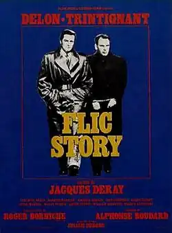 Flic Story is a French crime thriller[2] released on 1 October 1975, based on the autobiography of the same name written by French police detective Roger Borniche. Both film and book portray Borniche's nine-year pursuit of French gangster and murderer Emile Buisson, who was executed on 28 February 1956.[3] Directed by Jacques Deray, the film stars Alain Delon and Jean-Louis Trintignant as Borniche and Buisson respectively, supported by Claudine Auger[4] and André Pousse.