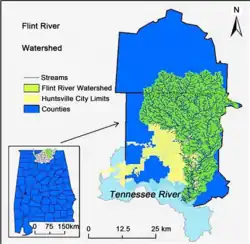 The Flint River, 65.7 mi (105.7 km) long[3] and draining an area of 568 sq mi (1,470 km2), is a tributary to the Tennessee River. The river rises in Lincoln County, Tennessee, and flows south into Madison County, Alabama, where most of the river's watershed (342 sq. mi.) is located. The land within this watershed is predominantly agricultural and has experienced significant recent residential growth from the city of Huntsville. The U.S. Geological Survey National Water-Quality Assessment Program is currently investigating water quality in the lower Tennessee River basin with several monitoring activities targeted in the Flint River Basin.