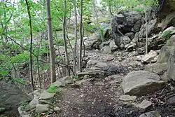 Flirtation Walk is a historic rocky foot trail at the United States Military Academy. The trail follows the shoreline of the Hudson River along the western bank. The southern trailhead starts at the edge of the Lincoln Hall parking lot and winds north along the river around Gee's Point and the West Point Light. The trail turns west-northwest, passing Battery Cove, where the Great Chain was anchored during the Revolutionary War. The trail ends near the helipad of West Point's North Dock. There also is an access trail that descends steeply to the river level from Trophy Point. The trail varies in consistency from level and even to steep and rocky. By academy tradition, only cadets and their guests may use the trail. Visitors escorted by cadets should wear sturdy shoes. The 1934 film Flirtation Walk was named after the trail. The film was nominated for the Academy Award for Best Picture.