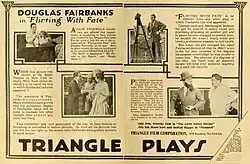 Flirting with Fate is a 1916 American film directed by Christy Cabanne and starring Douglas Fairbanks. It was produced by the Fine Arts Film Company and distributed by Triangle Film Corporation.[1][2]