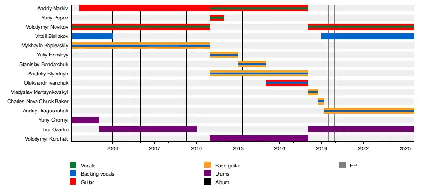 - Volodymyr Novikov — guitar, vocals (2001–2011, since 2018)
