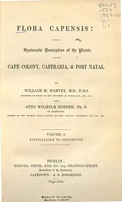 Flora Capensis is a book that described the flora found in colonial South Africa, encompassing the Cape Colony, Kaffraria and the Colony of Natal, as it was known during the second half of the 19th century. Creating the book was suggested by the famous English botanist Sir William Jackson Hooker. William Henry Harvey and Otto Wilhelm Sonder took up the work of writing the first three volumes of the Flora Capensis, which were published between 1860 and 1865 by Hodges, Smith and Co. in Dublin, and A.S. Robertson in Cape Town. Parts 4 to 6 were edited by William Turner Thiselton-Dyer and issued over the following decades, with the supplement published in 1933.[1]
