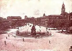 The fountain originally intended for the Victoria Gardens, is now surmounted by the figure of Plenty ("Courtesy of Special Collections, University of Houston Libraries."). History of the Flora Fountain is traced to the time when the Old Mumbai Fort was demolished in 1860 as part of the then Governor, Sir Bartle Frère's efforts to improve civic sanitation (municipal improvements) and the urban space requirements of the growing city. Prior to this demolition, the Fort had been built between 1686 and 1743 by the British East India Company with three gates (the Apollo Gate, the Church Gate and the Bazaar Gate), a moat, esplanade, level open spaces on its western fringe (to control fires) and residences. A small road called the Hornby Road, named after the then Governor of Bombay (Mumbai) between 1771 AD and 1784 AD, also existed at the old Fort area.[2][3] Consequent to the demolitions, the Hornby road was widened into a broad avenue and on its western side commercial plots were developed to build new commercial buildings in Neo Classical and Gothic Revival designs. The Dadabhai Naoroji Road (D. N. Road), developed into a veritable sight of colonial splendor with Crawford Market linked to the Chhatrapati Shivaji Maharaj Terminus anchoring the northern end and the Flora Fountain, forming the southern end of the Mile Long Road.[4]