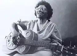 Molton played slide guitar in open D tuning.[11] Her guitar technique was described as "bottleneck" because, like many country blues players, she slid a broken bottleneck along the strings to make chord changes.[6] Reagon said that the bottleneck technique created a wailing sound and that her fingering created "a warbled tone". Molton fingered three to four strings at a time and played thirds and sevenths together, producing what Reagon called "a chordal wail with a buzz effect, a quality present in traditional African music."[4]