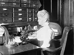 Flora Wambaugh Patterson (September 15, 1847–February 5, 1928)[1][2][3] was an American mycologist, and the first female plant pathologist hired by the United States Department of Agriculture.[4] She ran the US National Fungus Collections for almost thirty years, adding over 90,000 fungal specimens and expanding the collection six-fold, making it the largest of its kind in the world.[5][6] Patterson and her team discovered several species of disease-causing fungi that infect plants and pose a significant threat to agriculture.[7] Although modern agricultural practices can now keep many of these threats in check, pathogenic fungi still have the ability to decimate crop yield with devastating consequences.[7] Patterson’s work provided a basis for federal legislation to establish mechanisms to help prevent the introduction of new fungal plant diseases in the U.S.[5]