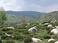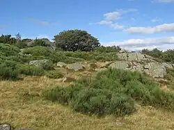 In the Massif Central, the open spaces of the mountainous regions are all man-made. There are three main types: pastures on volcanic mountains,[nb 3] which are very rich both ecologically and agronomically; moors or grasslands on granitic or schistose soils, which are less interesting agronomically but very rich in species; and finally, hay meadows. Within heathland, several sub-categories can be distinguished:[8] heathland with fern, purgative broom,[nb 4] callune or common bilberry[nb 5] (the latter two are generally found on thin granite soil). In addition, as moorlands are transitional areas between pasture and forest, they are often home to native tree and shrub species as diverse as birch, wild rose, hazel, hawthorn, rowan and whitebeam.[8]