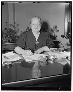 Considered the deputy head of the so-called white-collar branch of the Works Progress Administration,[3] her duties were often varied. As Assistant WPA Commissioner, she gave speeches about public health, safe drinking water, and medical care for low-income children on the radio in 1939,[11] and in 1941, Igor Stravinsky sought her help in contacting FDR about a performance of his newly completed arrangement of the national anthem, which he wanted to have performed by a WPA orchestra and broadcast nationwide.[12] As part of her work at the WPA Women's and Professional Projects, she was in regular contact with Eleanor Roosevelt.[13]
