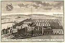 A 1744 travel book Les Délices du Païs de Liege ("The Delights of the country of Liege") described the property as having several large gothic buildings flanked with towers, and a large garden laid out in excellent taste. A terrace and gallery were decorated with elegant pillars surmounted by statues, and looked over a parterre with a fountain in the center. The garden was laid out with wide paths and held an étoile, or star-shaped design of clipped hedges, a labyrinth and two ponds, each with an island containing a formal garden in the center. The chateau at that time was property of the Count of Glimes de Jodogne, Marquis de Florennes and de Courcelles.[11]