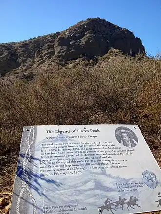 - NO. 225 FLORES PEAK – In 1857, Juan Flores and a band of outlaws murdered Sheriff James Barton and part of his posse at Barton Mound. Pursued by a posse led by General Andrés Pico, Flores and his men were finally caught on Flores Peak.[6]