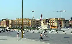 In the same period, he was active also in Albania (at that time practically an Italian protectorate), where he replaced Armando Brasini. There he designed the new city plan for Tirana, with the city center and the monumental department buildings around Skanderbeg Square, in Neo-Renaissance style with articulate angular solutions and giant order fascias (1932).[5] In the same years he designed also the royal palace of Durrës (1928–30), with a central tower and two wings,[5] and the royal villa at Scutari (1928), both works being commissioned by King Zog I.[3]