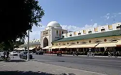 In 1923, Di Fausto started to work for the governor of the Italian Islands of the Aegean, Mario Lago.[3] This was a liberal and far-sighted diplomat, the first civilian governor of the islands after their occupation in 1912 during the Italo-Turkish War, who favored the peaceful coexistence among the different ethnic groups of the islands: Greeks, Turks, Ladinos and, since 1912, Italians.[3][4] His first work in Rhodes was the city plan, finished on 29 January 1926: he chose to retain almost totally the medieval walled city, isolating the ancient walls and introducing respect zones, and reused paths and alignments of the ancient plan by Hippodamus of Miletus for the new quarters.[3][4] The new city was erected outside the walls, south of the west bank of the Mandraki harbour, and was conceived as a garden city, an urban model which was highly fashionable in Italy in those years.[3] The main road of the new town, south of the Mandraki, was christened Foro Italico, and there Di Fausto designed the main buildings, preferring an eclectic style mixing Byzantine, Ottoman, Roman Renaissance, Venetian, Knight Chivalric and local elements.[3] This style was well suited for the multi-ethnic population of the island.[3] The most important works among the many which he designed in Rhodes city are: the Palazzo del Governo (today the prefecture building) built in 1926, in Venetian Gothic style, with a white and pink stone façade, resembling the Doge's Palace in Venice; the neo-Renaissance post office building of 1927; the Catholic cathedral of Saint John of the Knights (now Evangelismos Greek orthodox church), rebuilt among great quarrels in 1924–25, whose plans were reconstructed using engravings of the Church of St John of the Collachium, located within the walled city and destroyed in 1856; the Grande Albergo delle Rose, now Casino Rhodos, built with Michele Platania, but "cleansed" of all its deco embellishments in the late 1930s by Governor Cesare Maria de Vecchi; above all, the Mercato nuovo (Nea Agora, "New Market"), the center of the new city, an irregular polygonal structure enclosing the fishmongers pavilion, which possesses an unquestionable Oriental style.[3][4] Besides Rhodes, Di Fausto was active also in Kos, where his most important works are the Palazzo del Governo (1927–29) and the Catholic church of the Agnus Dei (1927), built with Rodolfo Petracco, with central plan and a bell tower tapered on the façade, considered his best work in the Dodecanese; in Kastellorizo, where he erected the Delegate's Building; in Kalymnos and Leros.[3][4] Since 1926 ever increasing differences of opinion with the governor pushed him to gradually abandon his commitments in the Aegean.[3] The quarrel ended in 1927 with a legal dispute, where Di Fausto showed that during his service in the Dodecanese he had designed no less than fifty buildings—houses, public buildings, churches, barracks, markets, schools—thirty two of them already built or in construction in 1927.[7] To keep this high pace of work, the architect worked also during his frequent boat trips between Italy and Rhodes.[7]