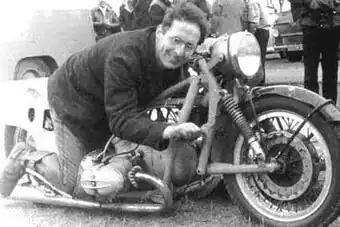 Camathias demonstrating the kneeling riding position on an unfinished race-replica, a road-version BMW pushrod-engined motorcycle and sidecar configuration, known as kneeler, which he was famously associated with in 500 cc Grand Prix racing using the BMW RS54 Rennsport overhead camshaft competition engine. | |||||||||||||||||||||||