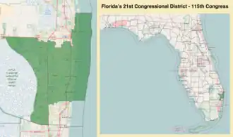 Democrat Ted Deutch represented the district after being elected in 2012. As a result of 2015's statewide redistricting, Deutch effectively swapped seats with Lois Frankel, the 22nd District's current representative. In 2016, Deutch sought election to the 22nd District seat while Frankel sought election from District 21.[5]