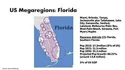 The Florida Megaregion is one of the eleven megaregions of the United States, as identified by the Regional Plan Association (RPA) through its America 2050 initiative. It encompasses a network of metropolitan areas in southern and central Florida, including Miami, Orlando, and Tampa, characterized by interconnected transportation, economic, and ecological systems. The megaregion is a significant economic driver, contributing to a substantial portion of Florida's population and economic output.